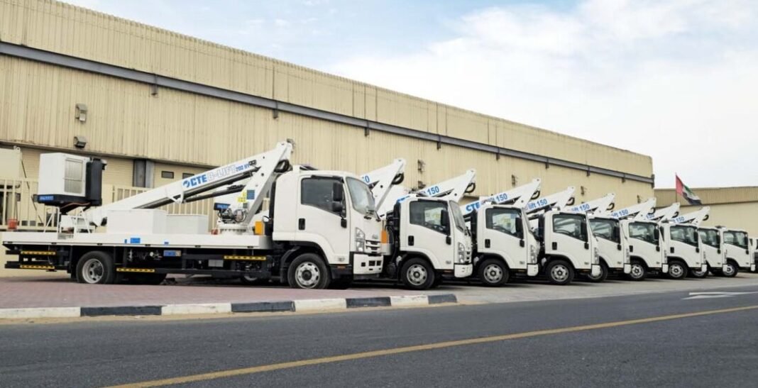 The Italian equipment strengthens electricity work with advanced designs and high safety standards. However, out of the ten new lifts, nine are B-Lift 150HY models, while one is a B-Lift 200HY. The equipment came through Precision Machinery, a distributor in the UAE, and its PM Truck division handled the supply process. The machines were delivered in kit form and installed on locally sourced Isuzu truck chassis.